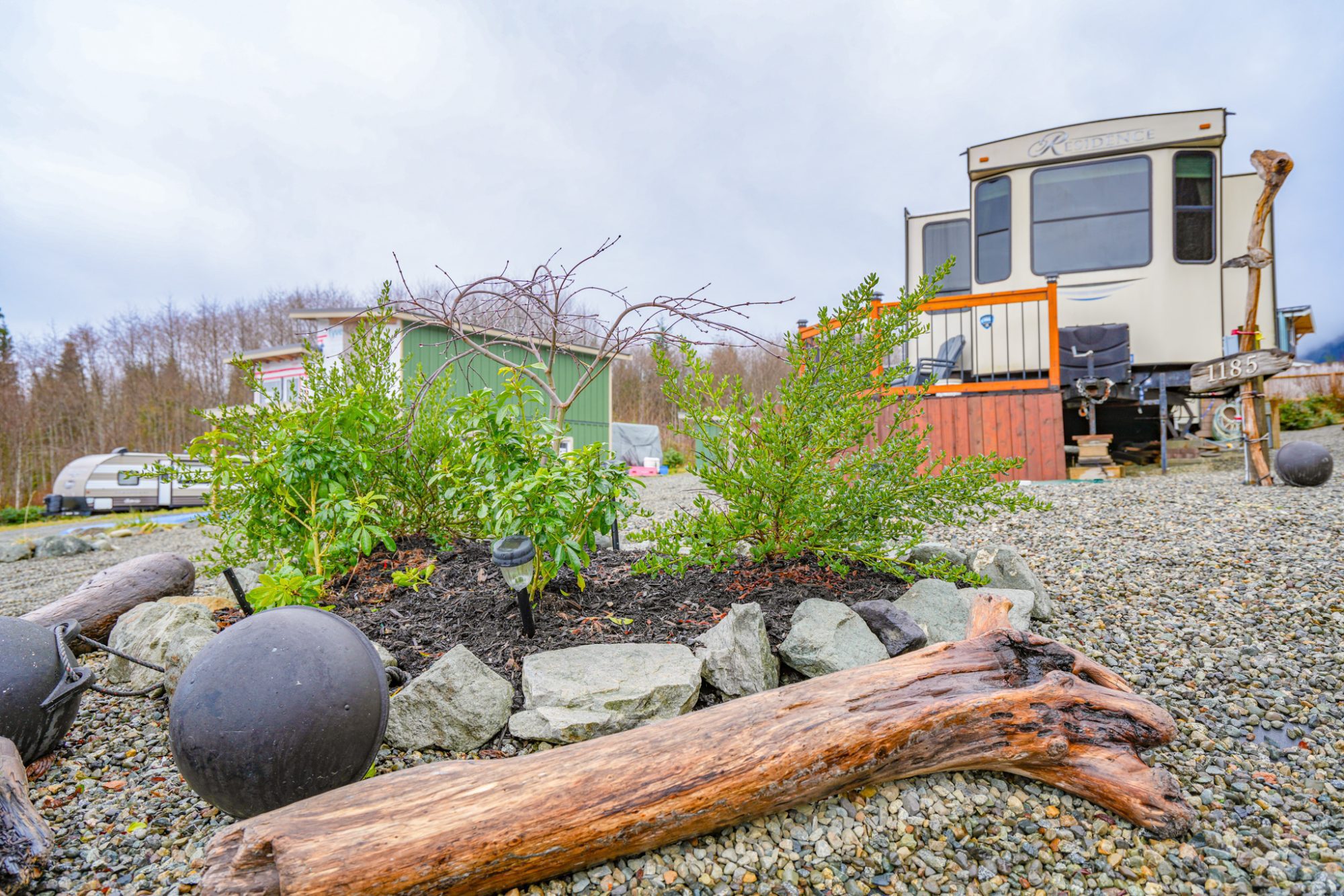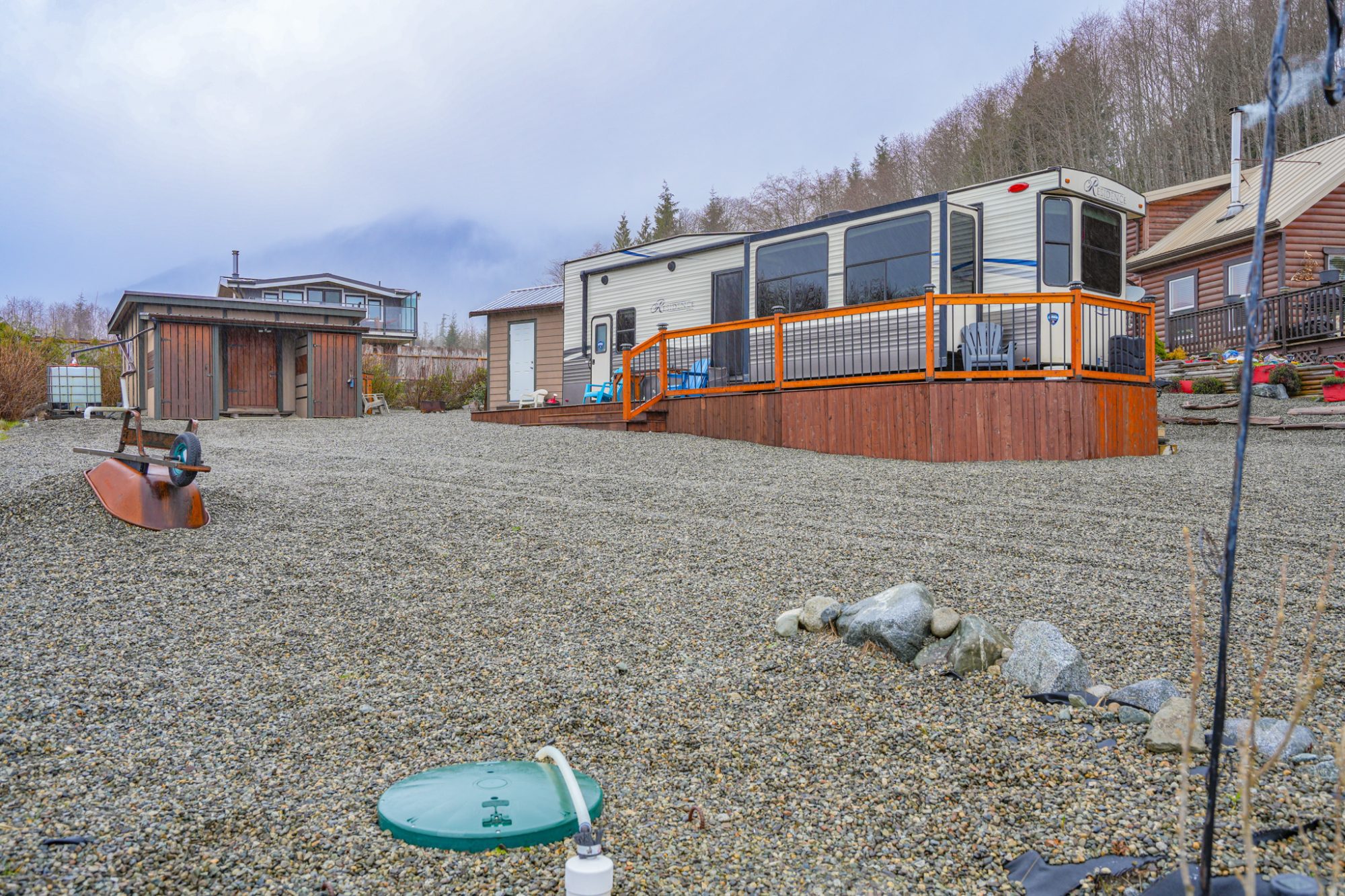 Set in a quiet, low-traffic area, this fully serviced seasonal retreat captures mountain views and the relaxed rhythm of true West Coast living. The property includes a 2018, 41-ft Residence trailer with loft and expansive cedar deck, offered turn-key with most furnishings, bedding, and kitchenware. Services include a water cistern, septic holding tank, and powered station with multiple outlets including 220V.